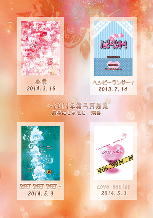 2014年度までで、単独での再版も何がしかの再録収録もしていない最後の3本(+続きの無料配布本)を収録しました。ラインナップは「ハッピーランサー!※」(2013年7月)「春霞」(2014年3月)「SWEET SWEET SWEET…」「Love potion※」(2014年5月)です。※印はサイトやpixivに全文upされていますが、紙媒体で欲しいというお声もちらほらありましたので…よしっと入れちゃいましたてへ。